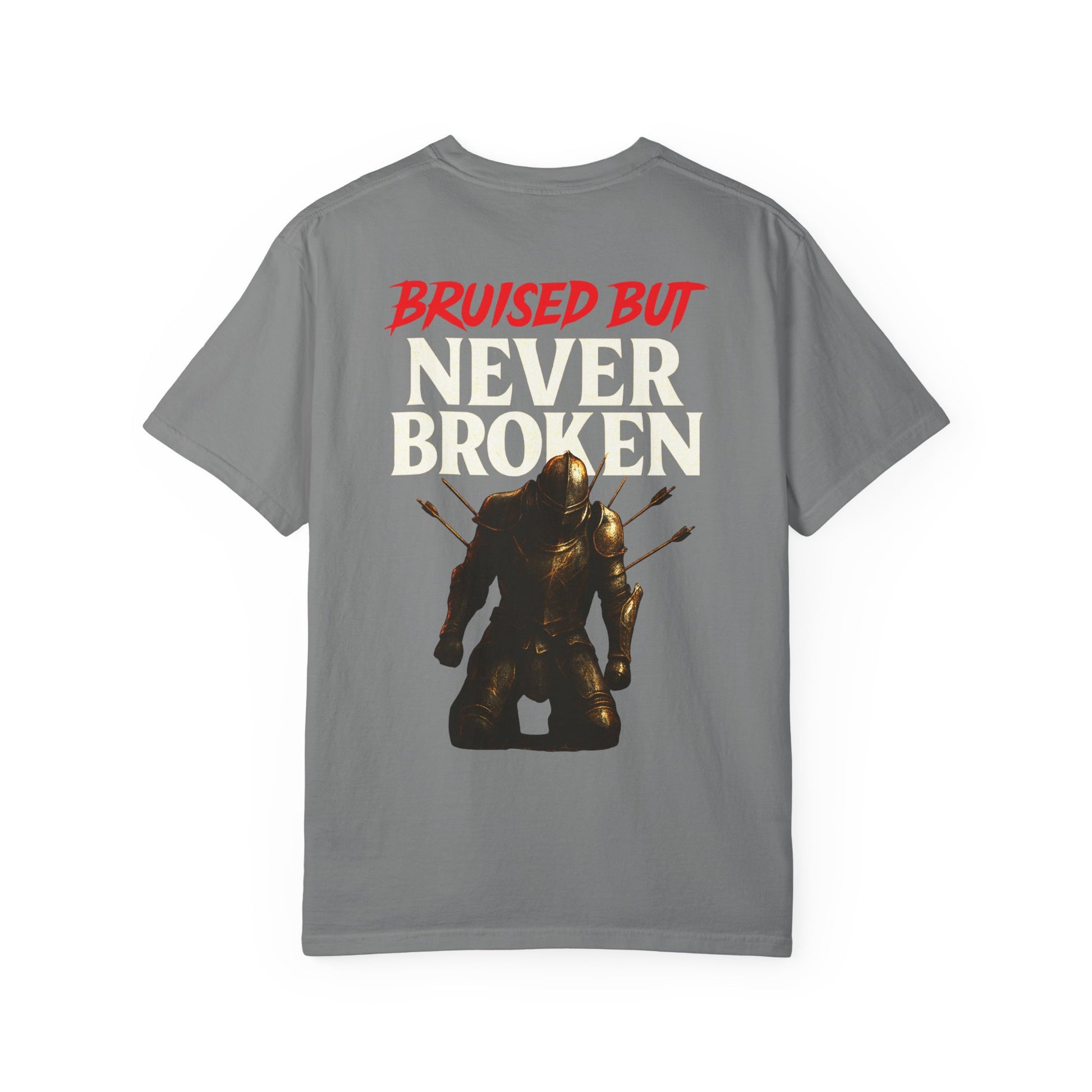 Stand tall in the Bruised But Never Broken tee. Built for resilience, this shirt represents strength through adversity - fathers, men, and leaders who fight battles but never quit. Featuring bold typography and a powerful warrior graphic, it's more than apparel; it's a statement of grit and legacy.